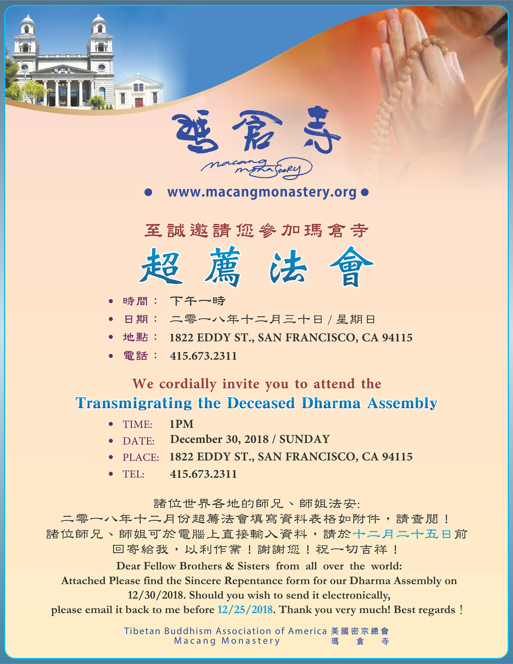 舊金山瑪倉寺十二月份超薦法會邀請