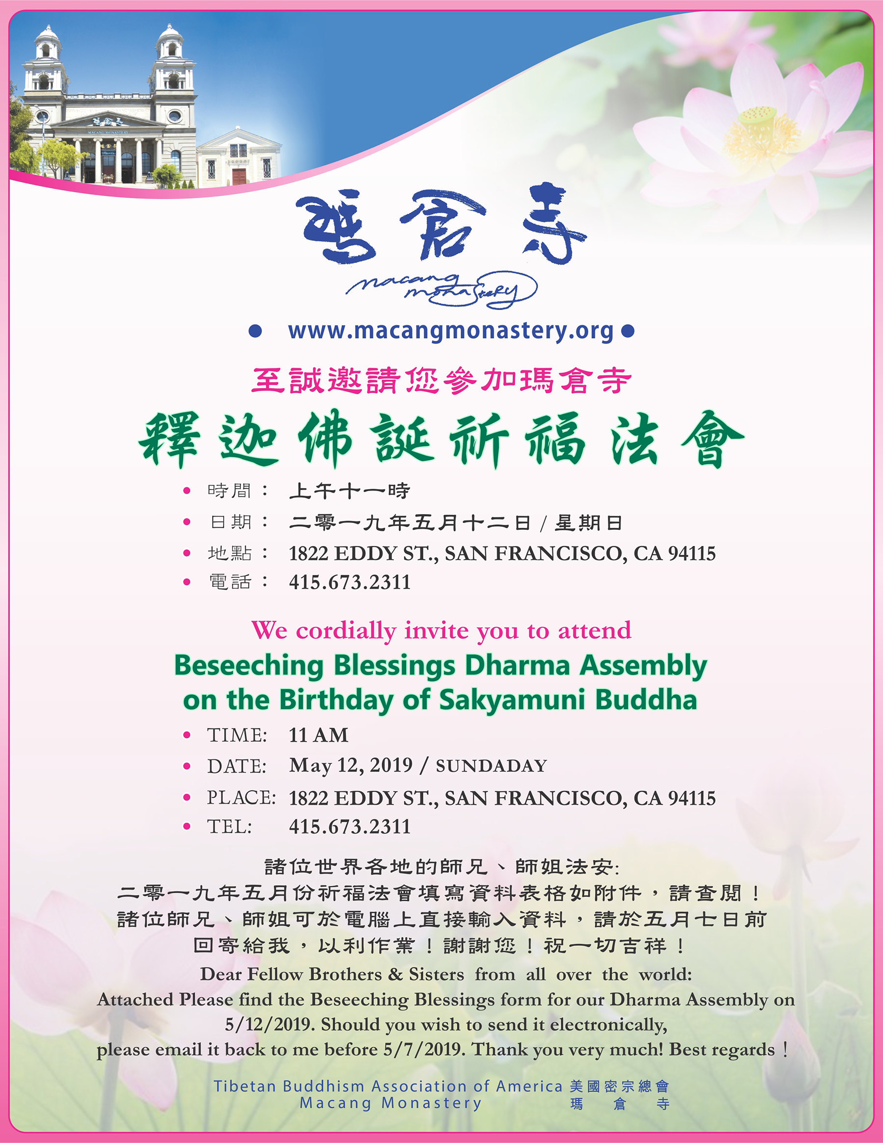 舊金山瑪倉寺五月份釋迦佛誕祈福法會邀請