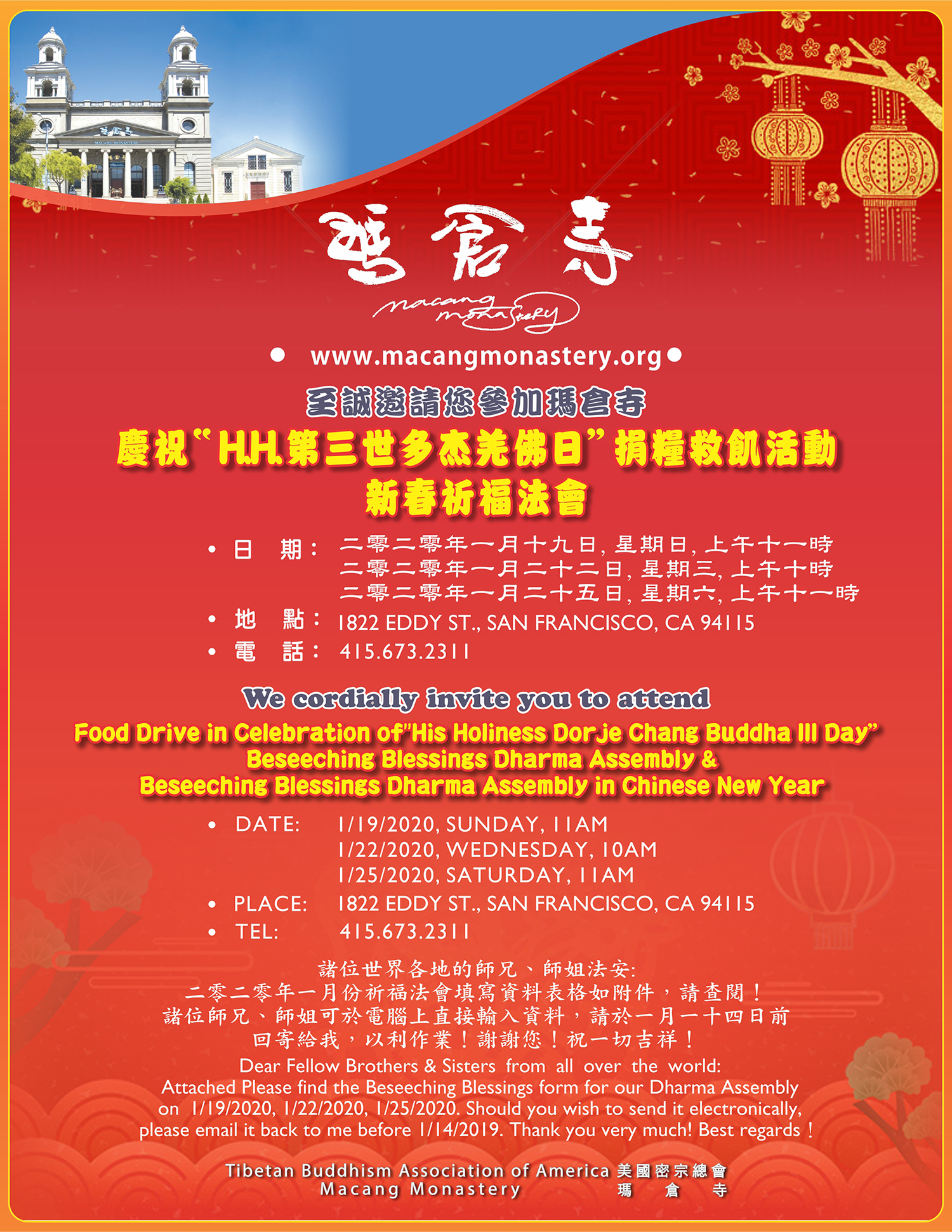 舊金山瑪倉寺慶祝HH第三世多杰羌佛日捐糧救飢活動新春祈福法會邀請